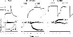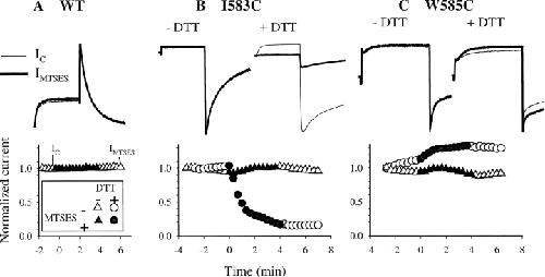 Figure 3. . MTSET has no effects on WT HERG (A), and its effects on I583C (B) and W585C (C) are enhanced by DTT pretreatment. In each panel, the upper part illustrates superimposed current traces under the control conditions (IC, thin trace) and after MTSET treatment (IMTSET, thick trace). IC is measured right before MTSET exposure, and IMTSET is measured after MTSET washout. An example of the time points at which IC and IMTSET are sampled is denoted in the time course of A. WT HERG has no DTT-treatment. I583C and W585C are either not DTT-treated (−DTT), or DTT-pretreated (+DTT, 5 mM for up to 4 h). −DTT and +DTT data are from different cells. The lower parts show time courses of changes in the peak amplitude of tail current before, during and after MTSET exposure from the same experiments as shown in the upper parts. Time zero marks the beginning of MTSET (1 mM) superfusion. Open symbols are data points recorded before and after MTSET exposure, whereas closed symbols are those during MTSET exposure. Triangles denote data from cells without DTT treatment, and circles are data from cells pretreated with DTT. (A) WT HERG recorded in 2 mM [K]o, channel is activated by 1-s depolarization pulses to 20 mV, and tail currents are recorded at −80 mV. (B) I583C recorded in 2 mM [K]o, activated by 1-s depolarization to 60 mV, tail currents recorded at −80 mV. (C) W585C recorded in 98 mM [K]o, activated by 1-s depolarization to 20 mV, tail currents recorded at −120 mV. |