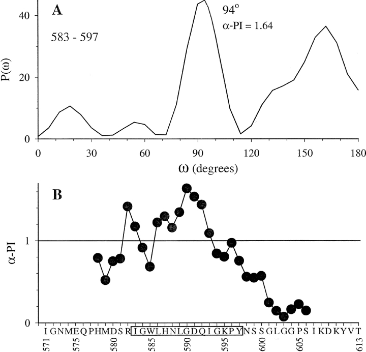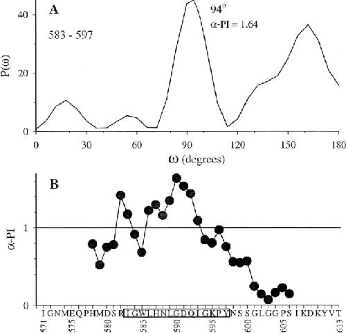 Figure 7. . Analysis of α-helical periodicity in the S5-P linker based on perturbations of activation gating induced by cysteine mutations (data from DTT-treated channels). The methods of calculating the Fourier transform power spectrum (P(ω) vs. ω) and α-periodicity index (α-PI) are described in materials and methods. (A) Fourier transform power spectrum of |ΔΔGo| values for the segment of 583–597 (value for the nonfunctional K595C is taken from <V>). (B) Windowed α-periodicity index analysis of S5-P linker of HERG. The α-PI values are calculated with a 15-residue sliding window and plotted against WT residues with selected position numbers along the abscissa (putative α-helix “583–597” is boxed). |