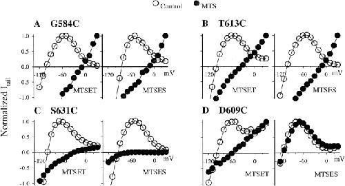 Figure 8. . Effects of MTSET and MTSES on the I-V relationship and Erev of four cysteine mutants: G584C (A), T613C (B), S631C (C), and D609C (D). In all cases oocytes have been DTT treated. The recording conditions, voltage clamp protocol, and data analysis are the same as those described for Fig. 2. After control data (open circles) are obtained, the cells are exposed to MTSET (1 mM) or MTSES (1 mM) while the channels are activated by constant pulses from Vh −80 to 20 mV for 1 s once per 30 or 60 s till changes in currents reach a steady state. The MTS reagents are washed out for ≥10 min and then currents after MTS modification (closed circles) are recorded. |