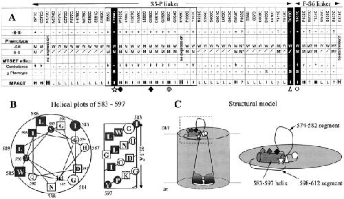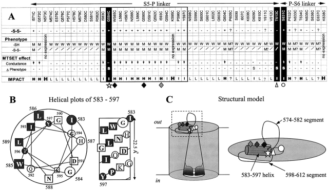 Figure 9. . (A) Summary table of effects of cysteine substitutions in the S5-P and P-S6 linkers on HERG channel function and response to MTSET. -S-S-, cysteine thiol side chains capable of forming disulfide bonds (+), or not (−). ?, data not conclusive. Phenotype, WT-like (W, strong C-type inactivation and high K+ selectivity) or mutant (M, disrupted C-type inactivation and low K+ selectivity), evaluated when thiol side chains are in reduced state (−SH) or in disulfide bonded state (-S-S-). M?, cysteine mutants have mutant behavior but the status of cysteine side chains unclear. /, not applicable because the introduced thiol side chains cannot form disulfide bonds. MTSET effect, decrease in channel conductance (downward arrow) or a switch of channel phenotype from WT-like to mutant (S). –, no effect. The 583–597 segment is boxed. G584C, W585C, G590C, I593C, T613C, and S631C are highlighted by different symbols below the table. (B) Plots of α-helical wheel (left) and α-helical net (right) of the 583–597 segment. Position numbers are labeled. Hydrophobic side chains are shaded gray. Hydrophilic side chains and glycine have no shade. Squares denote high-impact positions, while circles denote intermediate-impact positions. (C) Proposed structural model of HERG's pore domain. (Left) The helix formed by residues 583–597 is represented by a short cylinder. Symbols correspond to those in A and represent G584, W585, G590, I593, T613, and S631. For clarity, only one each of 583–597 helix, T613 and S631 are drawn for the channel. The HERG channel pore is drawn as a right side up “teepee” to reflect the following points: (1) The outer mouth of HERG may be narrower than that of Shaker or KcsA due to (a) a lack of important hydrogen bonds that can stabilize the outer mouth in the open state, and (b) the insertion of extra sequences from the S5-P linkers. (2) The inner mouth of HERG may be wider than that of Shaker or KcsA because it can accommodate drug molecules of large sizes (Mitcheson et al., 2000). (Right) An enlarged view of the boxed area. The model has the 583–597 helix orientated parallel to the plane of the cell membrane, with its NH2 end situated close to the pore entrance, so that G584 (star), like the two positions at the two ends of the P-loop, T613 (triangle) and S631 (circle), sits at the edge of extracellular pore entrance, with residues W585, G590, and I593 (diamonds) capable of interacting with a bound scorpion peptide toxin, ErgTx (Pardo-Lopez et al., 2002). The 574–582 segment forms an extracellular loop of low-impact positions. The 598–612 segment returns from the carboxyl end of the 583–597 helix to the pore, and along the way makes contacts with the outer surface of the channel at high- and intermediate-impact positions (604 and 609, respectively). |