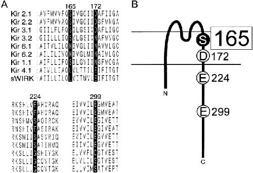Figure 1. . Conservation of four amino acid residues critical for inward rectification among the inward rectifier K+ channel family. (A) Alignment of the amino acid sequences of the inwardly rectifying K+ channel family at D172, E224, E299, and E165 of Kir2.1 and the surrounding region. The original reports used for the alignment are as follows. Kir 2.1 (Kubo et al., 1993a), Kir 2.2 (Koyama et al., 1994), Kir 3.1 (Kubo et al., 1993b), Kir 3.2 (Lesage et al., 1994), Kir 6.1 (Inagaki et al., 1995a), Kir 6.2 (Inagaki et al., 1995b), Kir 1.1 (Ho et al., 1993), Kir 4.1 (Bond et al., 1994; Takumi et al., 1995), and sWIRK (Kubo et al., 1996). (B) Schematic diagram of the structure of Kir2.1 based on the initial model by Kubo et al. (1993a). Both D172 and S165L are located within the α-helix of the second transmembrane region (M2). E224, situated just after M2, and E299, situated at the center of the putative cytoplasmic chain after M2, are also depicted. |