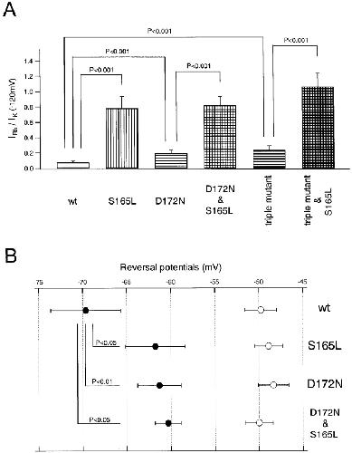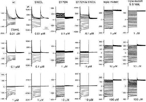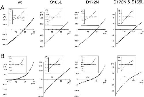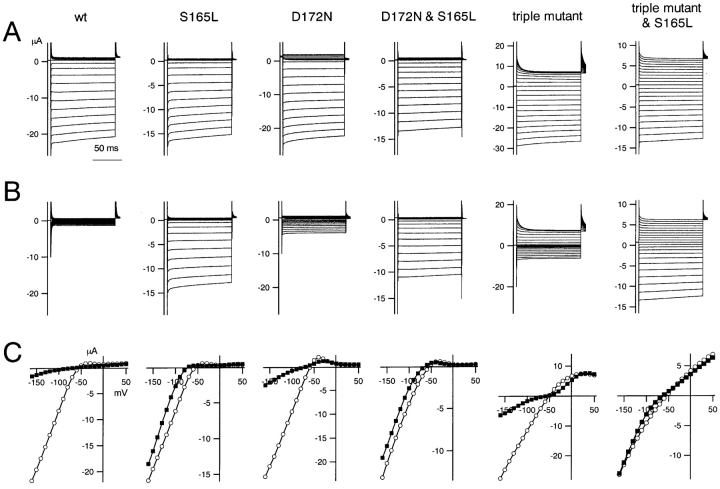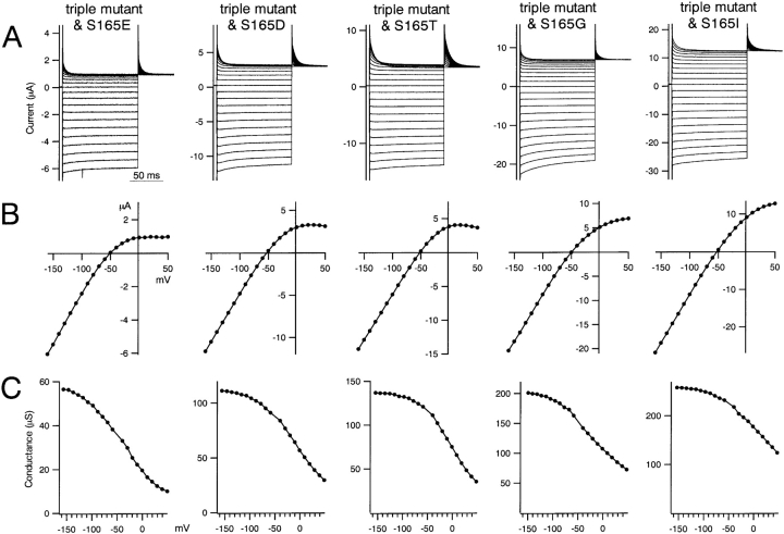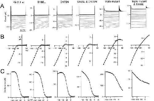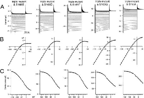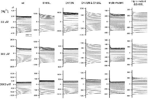 Figure 3. . Macroscopic currents recorded by two-electrode voltage-clamp of Xenopus oocytes expressing various mutants in which S165 in the D172N & E224G & E299Q triple Kir2.1 mutant was substituted with E, D, T, G, or L. The data were recorded and analyzed as in Fig. 2. |