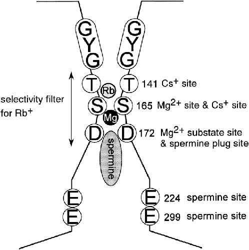 Figure 14. . Model of the pore structure of Kir2.1. The scheme explains the location and functional role of T141, S165, D172, E224, and E299. |