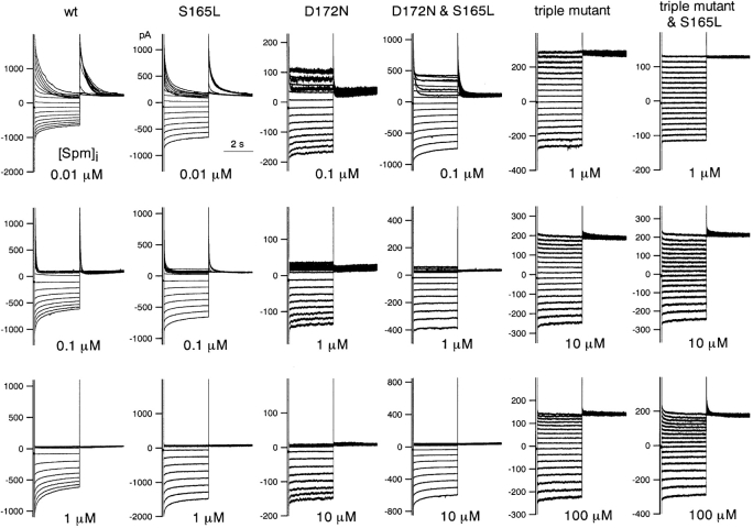 Figure 5. . Macroscopic currents recorded in the presence of the indicated concentrations of spermine from excised patches of HEK293T cells expressing wild-type or mutant Kir2.1. Note the difference in concentration ranges used for wild-type and S165L (0.01, 0.1, and 1 μM), D172N and D172N & S165L (0.1, 1, and 10 μM), and D172N & E224G & E299Q and D172N & E224G & E299Q & S165L (1, 10, and 100 μM) channels. K+o and K+i were 20 and 140 mM, respectively. The holding potential was −50 mV, and step pulses from 40 to −120 mV were applied in 10-mV decrements. |