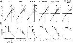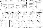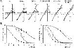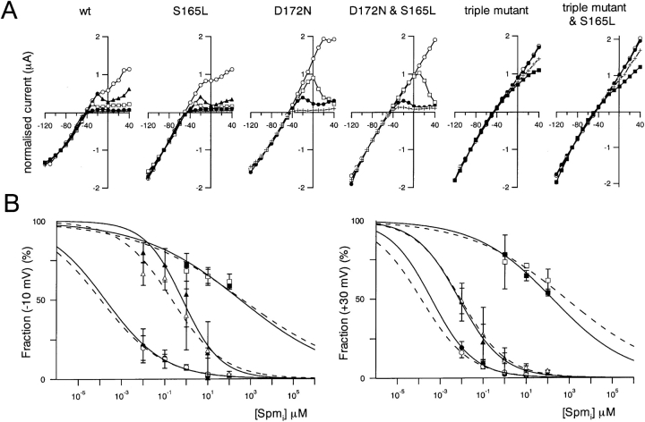 Figure 6. . Comparison of the susceptibility of macroscopic currents through wild-type and mutant Kir2.1 to blockade by intracellular spermine. (A) Normalized I-V relationships; values were measured 3 s after the onset of each step pulse. Current amplitudes were normalized to the values at −90 mV. The symbols stand for spermine concentrations of 0 μM (○), 0.01 μM (▴), 0.1 μM (□), 1 μM (•) 10 μM (+) and 100 μM (▪). (B) Concentration-response relationships for spermine blockade of outward K+ currents at −10 mV (left) and 30 mV (right). A rectification index was calculated first as the ratio of the current amplitudes at −10 mV or 30 mV to that at −90 mV. A value of 1 was then set as 100% for the data at −10 mV (left), and a value of 2 was set as 100% for the data at +30 mV (right). Symbols depict means ± SD (n = 3–7) for wild-type (•), S165L (○), D172N (▴), D172N & S165L (▵), triple mutant (▪), and triple mutant & S165L (□) channels. Solid lines (S165) and dotted lines (with S165L mutation) are curves fitted to Hill's equation. |