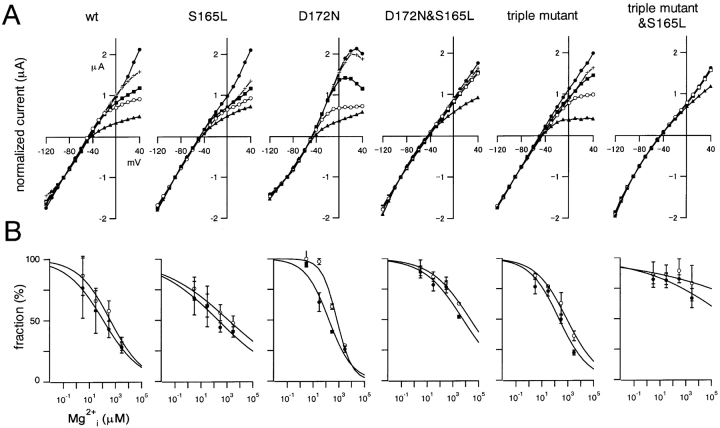 Figure 8. . Comparison of the susceptibility of macroscopic currents through wild-type and mutant Kir2.1 to blockade by intracellular Mg2+. (A) Normalized I-V relationships. Values were measured 500 ms after the onset of each step pulse. The symbols stand for Mg2+ concentrations of: 0 μM (•), 3 μM (+), 30 μM (▪), 300 μM (○), and 3,000 μM (▴). The current amplitudes were normalized to the values at −90 mV. (B) Dose–response relationships for Mg2+i blockade of outward K+ currents at −10 mV (○) and at 30 mV (•). The rectification index was calculated first as the ratio of the current amplitudes at −10 or 30 mV to that at −90 mV. A value of 1 was set as 100% for the data at −10 mV, and a value of 2 was set for the data at 30 mV. Symbols depict means ± SD (n = 3–7). To improve the fitting, the rectification index of 1.75 at 30 mV was set as 100% in the case of the D172N mutant, and 2.25 was set as 100% in the case of the triple & S165L mutant. This is thought to be because of changes in rectification properties in the absence of blockers. |
