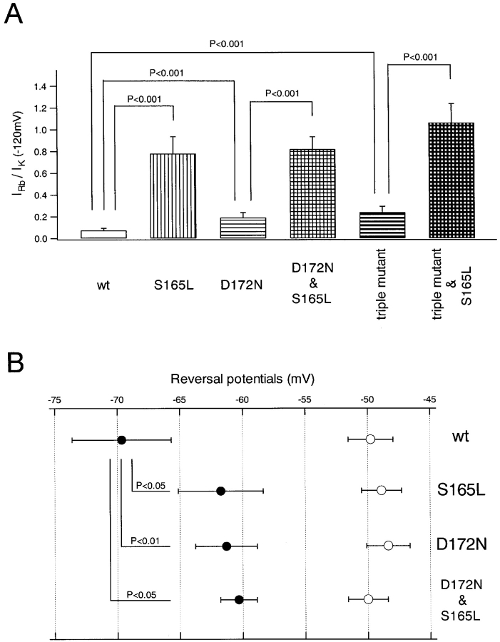 Figure 11. . Quantitative comparison of Rb+ permeance and the permeability ratio of Rb+ and K+ of wild-type Kir2.1 and the mutants. (A) The Rb+/K+ ratios of current amplitudes at −120 mV were calculated from the data in Fig. 9 C; means ± SD (n = 7–12 of each group) and values of P (Student's unpaired t tests) are shown. (B) Means and SD (n = 3–5 of each group) of reversal potentials shown in Fig. 10. The open and filled symbols show values of Erev(K+o) and Erev(Rb+o), respectively. The P values (Student's unpaired t tests) are also indicated. |