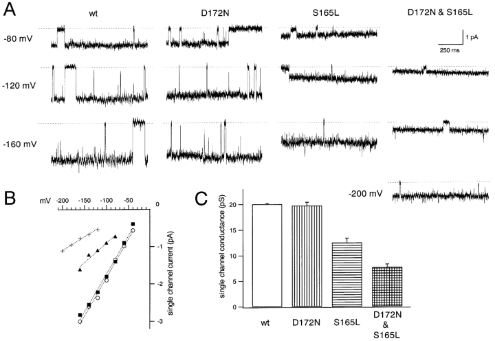 Figure 12. . Comparison of single-channel currents through the wild-type Kir2.1 and the mutants. (A) Representative single-channel currents recorded from Xenopus oocytes using the cell-attached patch configuration. The K+o in the pipette and in the bath were 140 mM. The holding potential for the displayed recordings were −80, −120, and −160 mV for the wild-type, D172N, and S165L channels, and were −120, −160, and −200 mV for the D172N & S165L double mutant. The dashed lines indicate the zero current level after subtracting the leak current. (B) Relationship of single-channel current amplitude and holding potential for wild-type (○), D172N (▪), S165L (▴), and D172N & S165L (+) channels. (C) Single-channel conductance calculated from the slopes of the plots in B; plotted are means ± SD (n = 4–6). |