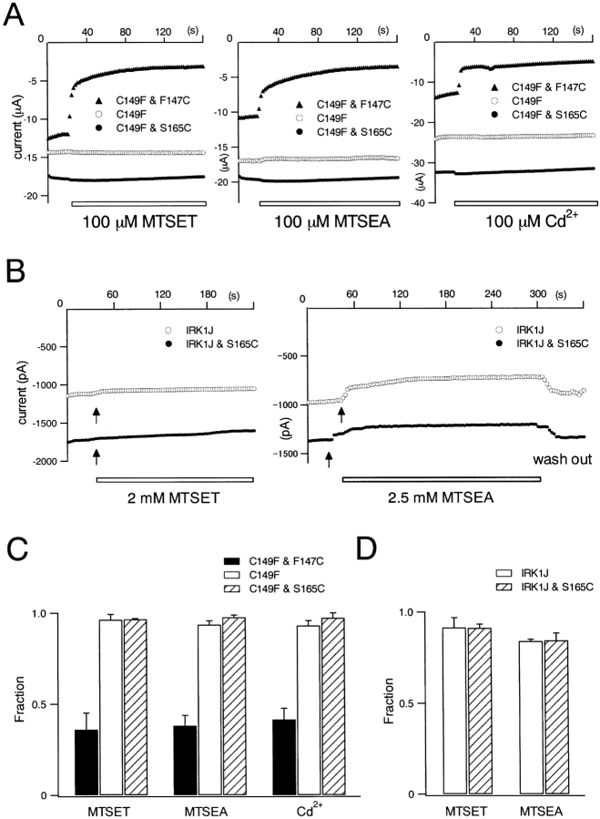 Figure 13. . Accessibility of S165C by cys-modifying reagents from extracellular and intracellular sides. (A) Currents recorded under two-electrode voltage clamp from Xenopus oocytes. The effects of either 100 μM MTSET, 100 μM MTSEA, or 100 μM Cd2+ were shown. The symbols are (○), C149F (negative control); (▴), C149F & F147C (positive control); and (•), C149F & S165C. Test pulses for 100 ms were given every 2 s to −130 mV from a holding potential of −30 mV, and current amplitudes were measured at 50 ms from the onset of each test pulse. (B) Currents recorded from transfected HEK293T cells under inside-out patch clamp. The effects of 2 mM MTSET or 2.5 mM MTSEA were analyzed. Test pulses for 200 ms were given every 3 s to −120 mV from a holding potential of −50 mV, and current amplitudes were measured at 100 ms from the onset of each test pulse. (C and D) Fractions of the residual current amplitudes after application of cys-modifying reagents from extracellular side at 120 s (C) and from intracellular side at 180 s (D). The values of means ± SD (n = 4) are shown. |