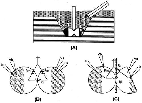Figure 1. Schematic representation of the dual oocyte perfusion apparatus that allows both cytoplasmic access to gap junction channels and monitoring of intercellular conductance. The chambers, designed by F. Cao, B.J. Nicholson, and G. Nottingham (Cao, 1997), are assembled from two halves to form compartments that remain separated by a thin coverslip with a small (0.7-mm diam) hole drilled centrally (A). Oocytes, in 600 µl of L15 media per compartment, establish coupling through the hole in the coverslip, with which the oocyte membrane forms a low resistance seal. During perfusion experiments, one oocyte is cut open with fine dissecting scissors, and at this time, the seal resistance replaces the membrane resistance of the open cell as shown in the equivalent circuit (B and C). |