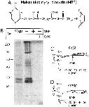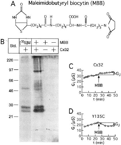 Figure 5. Structure of the thiol reagent maleimidobutyryl biocytin (MBB), and detection of its reactivity with Cx32 in the perfusion chamber. (A) Irreversible reaction occurs between the SH group of a cysteine and the maleimide ring, with the biotin moiety providing easy detection. (B) Biochemical determination that MBB reacts with Cx32 in the dual-oocyte perfusion system. Radiolabeled Cx32, immunoprecipitated from intact oocytes, shows a full-length and partially degraded form just below the 30-kD marker, and an aggregated dimer at ∼50 kD (left lane). Cx32 detected by avidin blot after intracellular perfusion of a paired oocyte with 1 mM MBB and immunoprecipitation of Cx32 (second lane from left) reveals the same bands, although the increased sensitivity of avidin detection revealed additional aggregated forms, both dimeric (50–60 kD) and trimeric (∼90 kD). No protein is detected for noninjected oocytes exposed to MBB or for perfused Cx32-injected oocytes not exposed to MBB (left two lanes). (C and D) Changes in junctional conductance (Gj) during typical SCAM experiments. In most cases, conductance increased steadily before and after addition of the reagent as shown for wtCx32 (C). In cases where a substituted cysteine was accessible, a decrease in conductance occurred after the addition of MBB, as shown for Cx32Y135C (D). The effect of MBB on each oocyte pair was determined by comparison of the conductance immediately before addition of the reagent, to that 20 min after its application (ΔGj). |