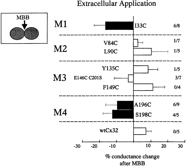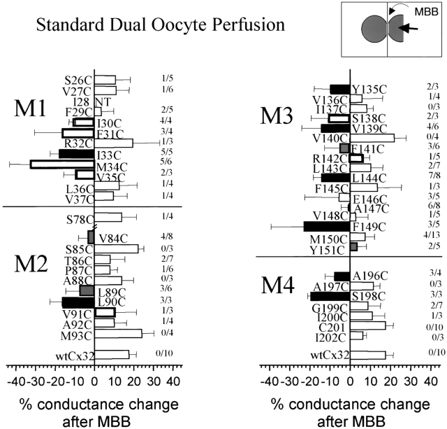 Figure 6. Mean percent changes in conductance after MBB perfusion. For Cx32 and the majority of cysteine substitution mutants, a small increase in conductance occurs after addition of the reagent, which represents a continuation of the trend in conductance before the application of MBB (open bars). A significant decrease in conductance compared to wt was observed after application of MBB to a number of cysteine substitution mutants (black bars, P < 0.01; shaded bars, 0.01 < P < 0.05). In all of these cases, block was also observed in ≥50% of perfusions (>60% for black bars). Bolded open bars indicate sites where cysteine substitution altered the gating properties of the channel. Hence, reactivity does not necessarily infer that the native amino acid lies in an accessible position. Error bars represent SEM. Numbers adjacent to the bars indicate the number of experiments where conductance was reduced versus the number of experiments conducted. |
