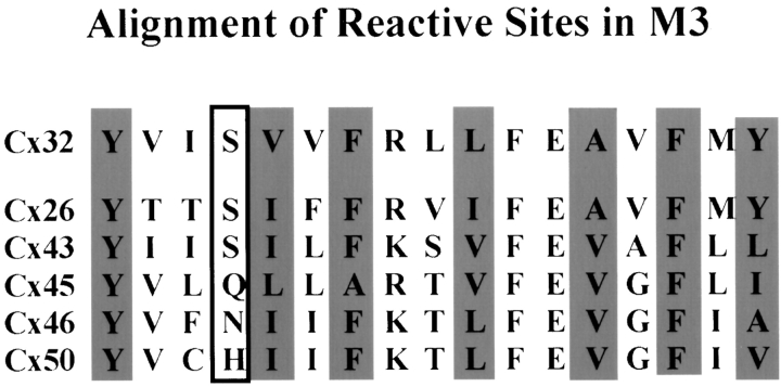 Figure 10. Aligned amino acid sequences for the third transmembrane domain of Cx32 and several other connexins. Highlighted residues indicate pore-lining residues in Cx32 and their corresponding sites in other characterized connexins (open-boxed site only tested in the closed state). The periodicity in the NH2-terminal two-thirds of M3 suggests α-helix, but this breaks down at the COOH-terminal end. Many sites are strictly conserved, whereas others show relatively minor changes despite reports of significant differences in permeability between connexins. This suggests that subtle differences in residue length or branching may define the affinity of binding sites within the pore. |