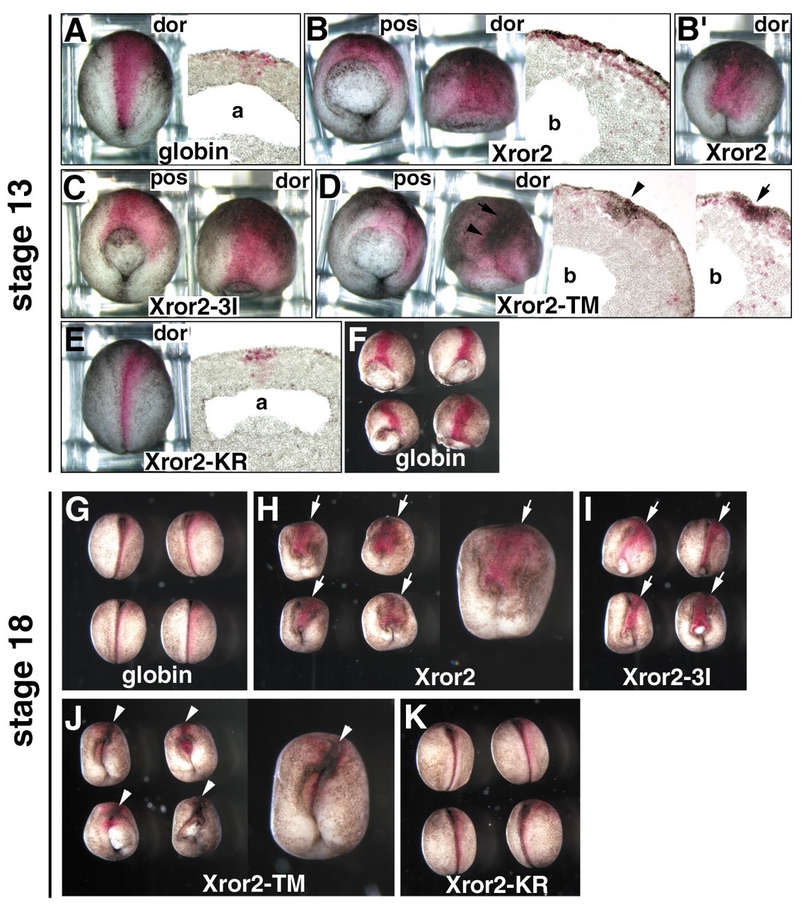 Fig. 5. Analysis of convergent extension and neural plate closure after overexpression of Xror2 constructs. mRNA (1 ng/embryo) of globin (A,G), Xror2 (B,Bâ²,H), Xror2-3I (C,I), Xror2-TM (D,J) or Xror2-KR (E,K) as indicated was injected together with nβ-gal mRNA (20 pg/embryo) for a tracer into one blastomere on the dorsoanimal and right side at the four-cell stage, and subjected to β-gal staining (red). (A-F) Stage 13 embryos; dor, dorsal view; pos, posterior view; a, archenteron; b, blastocoel. (G-K) Stage 18 embryos (dorsal view; anterior is upwards). (A) Globin-expressing control embryos and a section. As a result of normal convergent extension, nβ-galpositive cells were restrictedly distributed along the midline in the trunk region (see also G). (B,Bâ²) Xror2-expressing embryos (and section in B) with and without open yolk plug, respectively. nβ-gal-stained cells were laterally expanded on the right side of both mesoderm and ectoderm layers as a result of the inhibition of convergent extension. (C) Xror2-3I-expressing embryos showing weaker phenotypes than did wild type. (D) Xror2-TM-expressing embryos. nβ-gal-stained cells were laterally expanded, and condensation of pigmented cells was observed in nβ-gal-positive regions of ectoderm, as indicated by the arrow and arrowhead, each of which show the corresponding position in a whole embryo (second panel from the left) and in sections (third or fourth panel). When nβ-gal-positive cells were laterally expanded, the archenteron was not formed (B,D). (E) Xror2-KR-expressing embryo and section showing normal-looking cell movements. (F) Globin-expressing embryos with open yolk plug. In a few embryos that had open yolk plugs as a result of overexpressing globin, nβ-gal-positive cells still converged to the midline. (G) Globin-expressing embryos at stage 18. nβ-gal-positive cells were restrictedly distributed along the midline in the trunk region. (H) Xror2-expressing embryos which failed to close the neural plate in nβ-gal-positive regions (white arrows). Right panel, higher magnification. (I) Xror2-3I-expressing embryos showing weaker phenotypes than those of wild-type Xror2-expressing embryos. (J) Xror2-TM-expressing embryos. Expression of Xror2-TM resulted in neural groove-like formation with pigmented cells (white arrowheads). Right panel shows a higher magnification. (K) Xror2-KR-expressing embryos. Xror2-KR does not have apparent phenotypes, similar to globin control. |