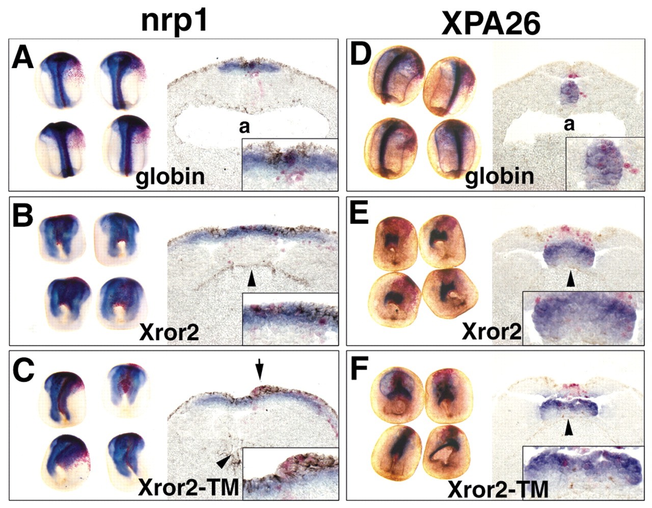 Fig. 6. Wild-type and its intracellular mutants of Xror2 affect convergent extension of neural tissue and notochord but not cell differentiation markers. Embryos were injected with mRNA as indicated, and were subjected at stage 18 to β-gal staining (red) and whole-mount in situ hybridization with pan-neural marker nrp1 (A-C) or notochord marker XPA26 (D-F) as probes. Right panel, sections of stained embryos; inset, higher magnification of neural tissue or notochord region. Expression domains of nrp1 were widened laterally and shortened anteriorly in Xror2- (B) and Xror2-TM- (C) expressing embryos, compared with globin-expressing embryos (A). nrp1 expression was not inhibited in nβ-gal-positive regions of Xror2- (B) and Xror2-TM- (C) expressing embryos (right panel, inset). Expression domains of XPA26 failed to elongate anteriorly and were located near the blastopore in Xror2- (E) and Xror2-TM- (F) expressing embryos, compared with those expressing globin (D) (left panel). Areas of XPA26 expression domains on section are much larger in Xror2- (E) and Xror2-TM- (F) expressing embryos than in globin-expressing embryos (D) (right panel, inset), whereas there is no inhibition of XPA26 expression in nβ-gal-positive regions. a, archenteron; arrowhead, collapsed archenteron; arrow, thickened pigmented epithelial layers of the ectoderm. |
