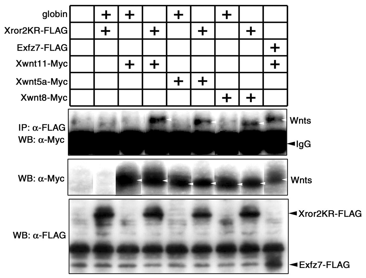 Fig. 9. Xror2 can associate with Xwnt11, Xwnt5a and Xwnt8. Proteins were extracted from embryos injected with mRNA as indicated, immunoprecipitated (IP) with anti-FLAG antibody, and subjected to western blotting (WB) using anti-Myc antibody (top). The equivalent amounts of proteins generated from injected mRNAs were confirmed by western blotting of lysates using anti-Myc (middle) or anti-FLAG (bottom) antibody. White arrowheads, Wnt proteins. Amounts of mRNA (ng/embryo): globin, 1 (with Xror2KR-FLAG) or 2; Xror2KR-FLAG, 2; Exfz7-FLAG, 0.5; Xwnt11-Myc, 0.5 (with Exfz7-FLAG) or 1; Xwnt5a-Myc, 1; Xwnt8-Myc, 1. |