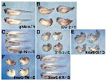 Fig. 8. Effects of Xror2 on activin-induced elongation of animal caps can be cancelled by Cdc42T17N, a dominant-negative Cdc42 mutant. mRNA injection and animal cap assay were performed as described in Fig. 7. All animal caps were treated with activin A. (A) Xror2 inhibits elongation of animal caps by activin. (B) Co-expression of Cdc42T17N with Xror2 partially rescues the extent of explant elongation. (C) Xwnt11 inhibits elongation of animal caps. (D) Co-expression of Cdc42T17N with Xwnt11 partially rescues explant elongation. (E) Globin-expressing animal caps (negative control) treated with activin show elongation. Amounts of mRNA (ng/embryo):Xwnt11, 0.5; Cdc42T17N, 0.6; Xror2, 0.2; globin, 1. (F) Summary of activin-induced elongation assay. The extent of animal cap elongation induced by activin (A-E) was classified by blind scoring as follows. -, no elongation; +, weak elongation; ++ moderate elongation; +++, strong elongation. |