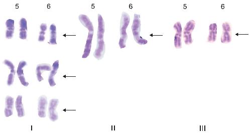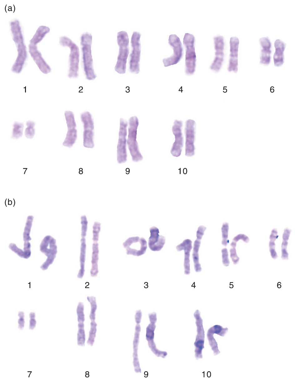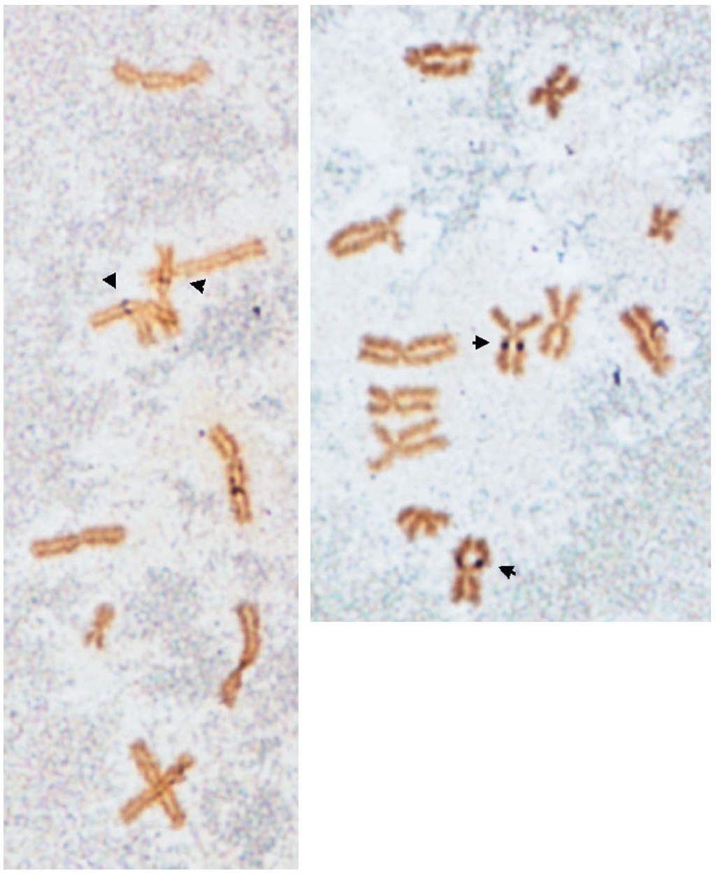 Developmental cytogenetic analyses of Xenopus tropicalis larvae from two origins were performed on stage 27-34 heads treated with colchicine. Standard G-band karyotyping using trypsin and chromosome mapping of 184 bands were examined. Although the main karyotype was 2n = 20, polyploidy (3n = 30 or 4n = 40) and aneuploidy were detected in each individual treated with colchicine, even those treated for only 1 h. The percentage of polyploid karyotypes was 10-20% across the total of measured metaphases. The mean mitotic index was 0.10. Chromosomal breaks and exchanges were detected at the secondary constriction of chromosomes 5 or 6. Ag-band detection showed clearly positive staining at the secondary constriction of chromosome 5, which corresponds to the nucleolar organizer region. Tandem duplication of negative G-bands at the secondary constriction of chromosome 6 and the short arm of chromosome 10 was suggested by this study. X. tropicalis thus provides a good model to study the mechanism and effects of chromosomal abnormalities, gene mapping and tissue specific gene expression in the developmental process.