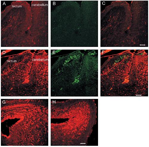and BrdU (green; the optic tectum and cerebellum are