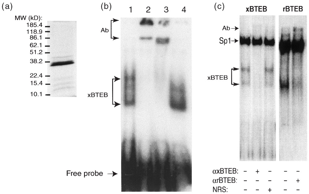 empty vector programmed lysate; data not shown. (c) Overexpression of X. laevis and rat BTEB in XTC-2 cells. EMSA analysis of