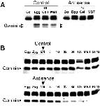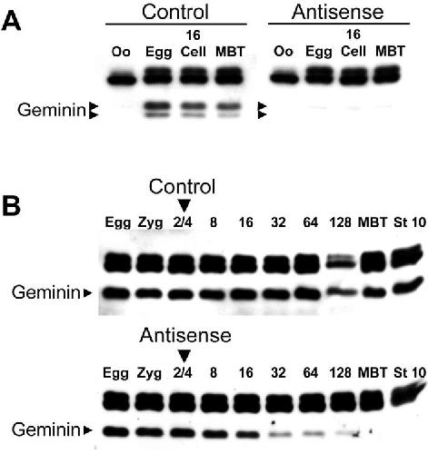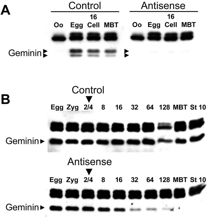 Fig. 1. Depletion of geminin by antisense oligonucleotides. (A) Stage VI Xenopus oocytes were injected with a phosphorothioate antigeminin or control oligonucleotide and fertilized by the host transfer technique. At various points in development, the amount of geminin was determined by immunoblotting (arrowheads). The higher molecular weight bands are unrelated proteins that cross-react with the antibody. Oo, oocyte before progesterone treatment; Egg, oocyte after progesterone treatment; 16, 16-cell embryo; MBT, mid-blastula transition. (B) Same as A, except two-cell embryos were injected with morpholino antigeminin or control oligonucleotide; 8â128, cell number at time of harvest; stage 10, onset of gastrulation.