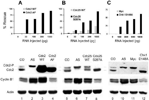 Fig. 5. Suppression of the Chk1 pathway rescues the cell cycle arrest caused by geminin depletion. (A) Top, Cdc2 AF rescues geminin deficiency. Two-cell embryos were sequentially injected with morpholino antigeminin oligo and RNA encoding Cdc2 WT or Cdc2 AF. The number of embryos that continued dividing past the MBT was determined by visual inspection (Figure 2, B and D). The chart shows the combined results of two independent experiments. Each data point represents 22â36 embryos. Bottom, after the MBT, the extent of Cdc2 phosphorylation and the cyclin B1 level were determined by immunoblotting. CO, uninjected embryos; AS, embryos injected with antisense oligo; AS + Cdc2 WT, embryos injected with antisense oligo and 1000 pg/side of WT Cdc2 RNA; AS + Cdc2 AF, same except Cdc2 AF RNA was injected. (B) Cdc25 S287A rescues geminin deficiency. Same as described above, except the embryos were injected with RNA encoding WT Cdc25 or Cdc25 S287A. (C) Chk1 D148A rescues geminin deficiency. Same as described above, except the embryos were injected with RNA encoding Chk1 D148A or an inert Myc tag.