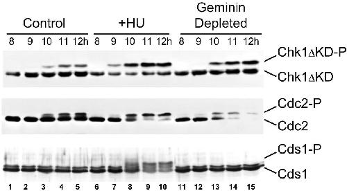 Fig. 6. Geminin depletion causes increased Chk1 phosphorylation. Top, Xenopus embryos were injected with RNA encoding his6-Chk1ÎKD at the two-cell stage. At various times the degree of his6-Chk1ÎKD phosphorylation was determined by immunoblotting with anti-his6-tag antibody. Injected embryos were either left untreated (control), cultured in 20 mM hydroxyurea (+HU), or injected with antigeminin oligo (geminin depleted). Times indicate hours postfertilization (p.f.). In this experiment the MBT occurred just after 9 h p.f. Middle, same experiment, but the blot was probed with anti-Cdc2 antibody. The loss of Cdc2 staining after 10 h in the geminin-depleted embryos is not reproducible (Figures 4 and5). Bottom, same experimental protocol as described above, except the embryos were not injected with his6-Chk1ÎKD RNA and the blot was probed with anti-Cds1 antibody. In this experiment the MBT occurred around 10 h p.f.