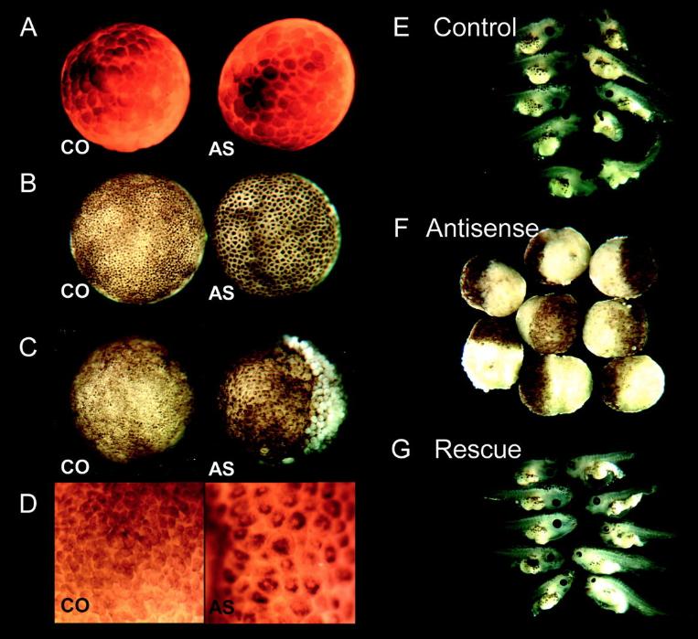 Fig. 2. Development of geminin-depleted embryos. (AâD) Geminin depletion causes a cell cycle arrest. Two-cell embryos were injected with morpholino control oligonucleotide (CO) or antisense-geminin oligonucleotide (AS). (A) Early blastula stage. (B) Shortly after the midblastula transition. (C) Gastrula stage 12, animal view. (D) Stage 12, detail of animal view. (EâG) Geminin RNA rescues geminin depletion. Stage VI oocytes were injected with control phosphorothioate oligonucleotide (control), antigeminin oligo (antisense), or antigeminin oligo followed by 240 pg of WT geminin RNA (rescue). Oocytes were fertilized by the host transfer technique and cultured in vitro. The embryos in the middle panel were fixed at stage 12, those in the top and bottom panels were fixed at stage 41â45.