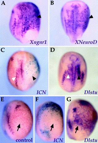 Fig. 2. Proneural genes activate and Notch signaling represses XGadd45-γ. Dorsal (AâD) and lateral (EâG) views of midneurula embryos. Embryos were injected with 1 ng of the indicated mRNAs in one blastomere at the two-cell stage together with 0.3 ng of lacZ mRNA. The injection side was determined by X-Gal staining. Xngnr1 (A) and XNeuroD (B) mRNA promote ectopic XGadd45-γ expression (arrowheads). Increased (C) or decreased (D) Notch signaling, respectively, represses or activates XGadd45-γ expression (compare uninjected and injected sides, pointed at with white and black arrowheads, respectively). XGadd45-γ expression in scattered cells of the non-neural ectoderm (E) is also repressed (F) or activated (G) when Notch signaling is increased or decreased, respectively (arrowheads). |