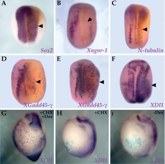 Fig. 6. Overexpression of HD-GR-E1A mRNA affects neural markers. Dorsal views (AâF) or lateral views (GâI) of neurula stage embryos injected with 0.5 ng of HD-GR-E1A mRNA with (GâI) or without (AâF) 0.3 ng of LacZ mRNA. Dexamethasone was added at stage 12.5 (AâF) or at stage 13.5 (G) to avoid suppression of neural plate formation caused by interference with Xiro function at gastrula stages ( Gómez-Skarmeta et al., 2001). The injected side was determined by anti-Myc staining (AâF) or XGal staining (GâI). (A) Sox2 is not affected. However, Xngnr1 (B), N-tubulin (C) and XGadd45-γ (D) expressions are suppressed (arrowheads). Coinjection with Xngnr1 mRNA (1 ng) rescued N-tubulin (not shown) and XGadd45-γ (E, arrowhead) expression. In embryos injected with 0.5 ng of HD-GR-E1A mRNA, XDl1 (F) is overexpressed. (G) This activation was also observed when protein synthesis was blocked. (H,I) No ectopic XDl1 was observed in injected embryos in the presence of CHX and in the absence of the hormone (H), or just in the absence of the hormone (I). |