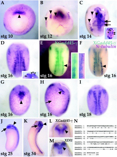 Fig. 1. Expression and protein sequence of XGadd45-γ. (A) Vegetal view; (BâF,I) dorsal views; (G) ventral view; (H,J,K) lateral views. (A) XGadd45-γ is expressed in the dorsal mesoderm (arrowhead) at early gastrula stages (stg). Throughout gastrulation, XGadd45-γ is also expressed in scattered cells of the animal region (not shown). (B) At mid-late gastrula, three rows of cells at each side of the midline start to accumulate XGadd45-γ mRNA (arrowheads). (C) These rows of XGadd45-γ expressing cells are clearly visible in the early neurula (black arrowheads). XGadd45-γ is also expressed in forming somites (arrows) (Jen et al., 1999) and in a horseshoe-shaped domain within the anterior neural plate (white arrowhead). This pattern is similar to that of XDl1 (inset). (D) A similar expression profile is observed at mid neurula stages. (D, inset) Transverse section of a mid neurula revealing XGadd45-γ expression in three neuroectodermal rows of cells (black arrowheads), in the notocord (white arrowhead) and in somites (arrow). (E) Mid neurula doubly hybridized for XGadd45-γ and N-tubulin and shown after the first chromogenic reaction to detect XGadd45-γ mRNA (cian). (F) After second chromogenic reaction to detect N-tubulin (purple). Insets in (E) and (F): high magnifications views of the lateral neural stripe pointed at with an arrowhead in their corresponding panels. During neurula stages, XGadd45-γ is also expressed in the prospective cement gland (G, arrowhead), trigeminal placode (H, arrowhead) and in scattered cells in the non-neural ectoderm (H, arrow). XGadd45-γ expression is detected in the same sites at later stages (I). In late neurula (J) and tailbud stages (K), XGadd45-γ is expressed in territories in which secondary neurogenesis takes place, such as the eye (arrows) and brain (arrowheads). (LâM) Hindbrain transverse sections of tailbud embryos showing XGadd45-γ (L) and XDl1 (M) domains of expression (arrowheads). (N) Amino acid sequence alignment of Xenopus and human Gadd45-γ proteins (accession numbers AJ414384 and AF078078, respectively). Identical residues are indicated by dashes. |