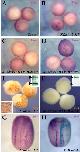 Fig. 3. XGadd45-γ overexpression antagonizes cell division. Animal views of stage 11 embryos injected with 0.5 ng of the indicated mRNAs and/or 10 ng of the indicated morpholino oligonucleotide and 0.3 ng of lacZ mRNA. Embryos were in situ hybridized for lacZ mRNA (blue) and stained for anti PH3 as a mitotic marker. (A) Distribution of mitotic cells in stage 11 control embryos injected with lacZ mRNA alone. (B,C) Expression of XGadd45-MT (B) or MT-XGadd45 (C) reduces the number of dividing cells. (D,E) Injection of MOGadd45 (D) or a control morpholino oligonucleotide (E) did not affect the number of dividing cells. (F,G) Reduction of mitotic cells promoted by XGadd45-MT mRNA is not affected by coinjection of a control morpholino (F) but is antagonized by coinjection of MOGadd45 (G). (H) MOGadd45 cannot interfere with MT-XGadd45 promoted cell cycle arrest. |