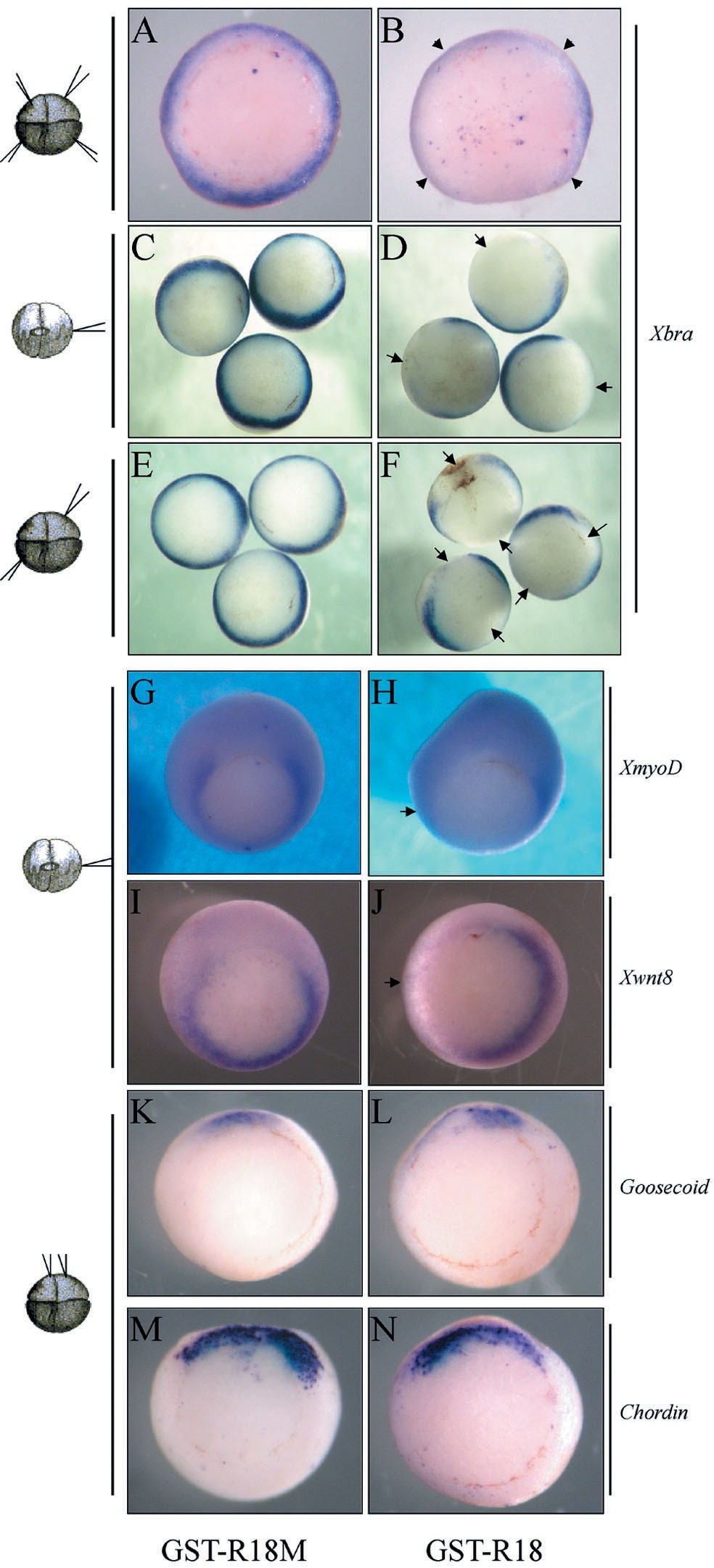 injected side (indicated by arrows) of GST-R18 injected embryos (D). (E,F)