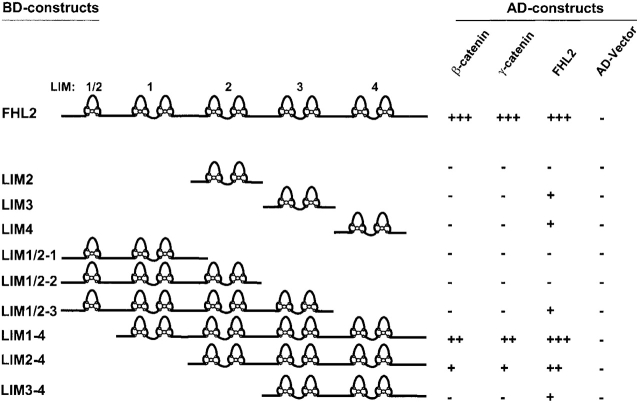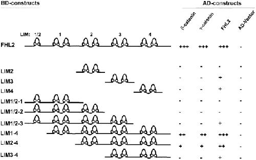 Figure 4. Identification of the minimal binding site on FHL2 for β-catenin and γ-catenin by yeast two-hybrid assays. Yeast Y190 cells were cotransformed with GAL4-DNAâbinding domain and GAL4âactivation domain chimeric constructs and proteinâprotein interactions were evaluated by a β-Gal filter assay. The known interaction of FHL2 with its own subdomains was used as a positive control, and the empty AD-vector served as a negative control.