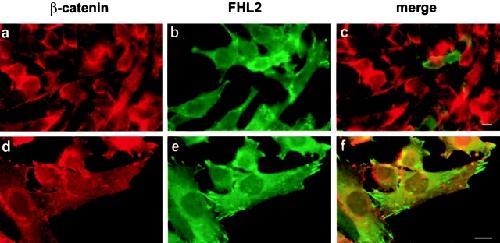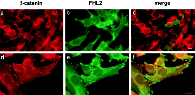 Figure 5. Subcellular localization of FHL2 and β-catenin. C2C12 cells cultured on coverslips were transiently transfected with EGFPâFHL2. Cells immunostained with anti-βâcatenin mAb and Alexa-conjugated goat antiâmouse polyclonal antibody were analyzed by fluorescence microscopy. Although β-catenin (red) is concentrated at the membrane and at cellâcell contacts, EGFPâFHL2 (green) is concentrated at focal adhesion sites. The merged images show no colocalization of the two proteins at membrane level. Panels aâc and dâ f represent pictures taken with 40à or 63à objectives, respectively. Bars, â¼10 μm.