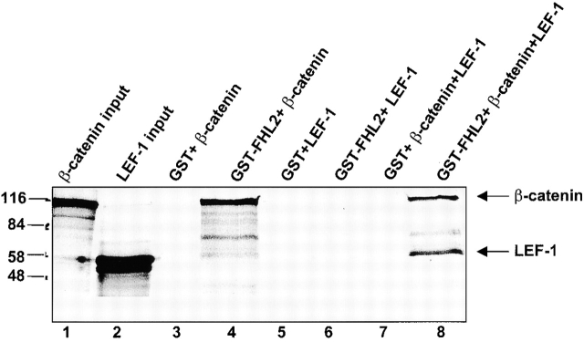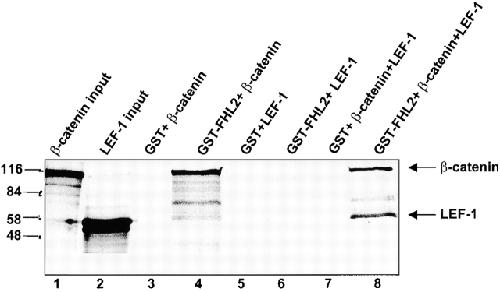 Figure 8. β-Catenin forms a ternary protein complex with FHL2 and LEF-1. Recombinant GSTâFHL2 (lanes 4, 6, and 8) or GST (lanes 3, 5, and 7) proteins were incubated with [35S]methionine-labeled β-catenin (lanes 3 and 4) or [35S]methionine-labeled LEF-1 (lanes 5 and 6), or with both (lanes 7 and 8). After extensive washing, proteins retained by GST or GSTâFHL2 were analyzed together with 10% of the input material (lanes 1 and 2) by SDSâPAGE and fluorography.
