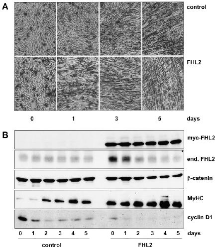 Figure 9. Ectopic expression of FHL2 promotes differentiation of C2C12 myoblasts. (A) C2C12 myoblasts infected with retroviruses containing the pBabe vector alone (control) or pBabe with myc-FHL2 (FHL2) were cultured in growth medium until 90–95% confluency (day 0) and then shifted to differentiation medium (days 1–5). (B) Lysates (20 μg protein/lane) from cells cultured in growth medium (day 0) or in differentiation medium (days 1–5) were immunoblotted with anti-myc mAb 9E10, anti-FHL2 mAb, anti–β-catenin mAb 14, anti-MyHC mAb NOQ7.5.4D, or anti–cyclin D1 mAb DCS-6.