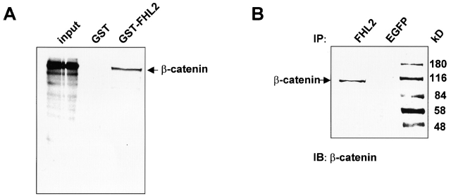 Figure 1. Interaction between FHL2 and β-catenin in vitro and in vivo. (A) Recombinant GST or GSTâFHL2 fusion protein was incubated with [35S]methionine-labeled β-catenin. After extensive washing, proteins retained by GST or GSTâFHL2 were analyzed together with 10% of the input material by SDSâPAGE and fluorography. (B) C2C12 cell lysates were immunoprecipitated (IP) with rabbit pAbs against FHL2 or EGFP (negative control) as indicated and analyzed by SDS-PAGE and immunoblotting (IB) using the antiâβ-catenin mAb 14. The arrows show coprecipitated β-catenin.