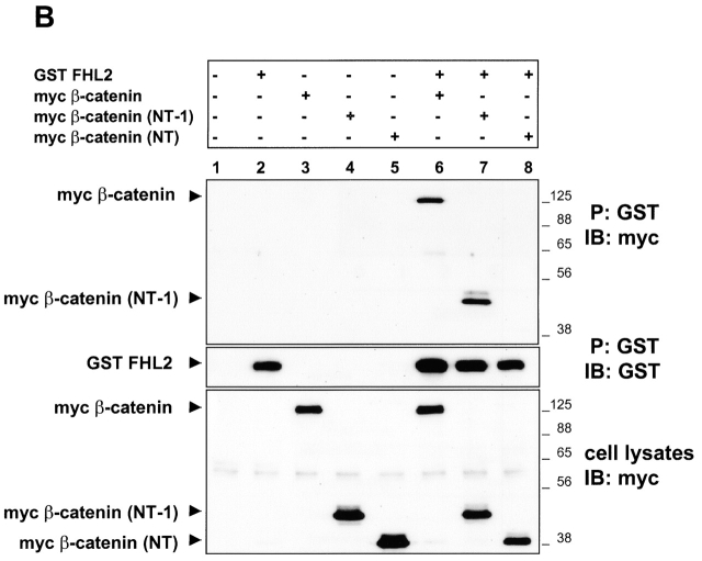 Figure 3. The NH2 terminus of β-catenin is sufficient for binding to FHL2. (A) Yeast Y190 cells were cotransformed with GAL4-DNAâbinding domain (FHL2) and GAL4âactivation domain (β-catenin) chimeric constructs, and proteinâprotein interactions were evaluated by a β-Gal filter assay. The numbers over the diagrams indicate β-catenin amino acids encoded by each construct. The arrangement of armadillo repeats is based on Hulsken et al. (1994). (B) HEK 293 cells were transiently transfected with cDNA constructs as indicated and lysed with RIPA buffer. The presence of myc-tagged β-catenin and its deletion mutants in GSTâFHL2 precipitates (P) were detected by immunoblotting (IB) with myc antibody (top blot). To ascertain the amount of precipitated FHL2 protein, the blot was redeveloped with antibodies against GST. The blot on the bottom shows the expression in transfected cells of full-length mycβ-catenin and deletion mutants; β-catenin (NT-1) with the NH2 terminus plus the first armadillo repeat, and β-catenin (NT) with the NH2 terminus only. 10 μg of total cell lysates were loaded.