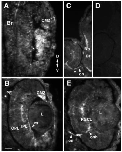 retina and brain are immunopositive. B: At stage 37/38, retinal ganglion
