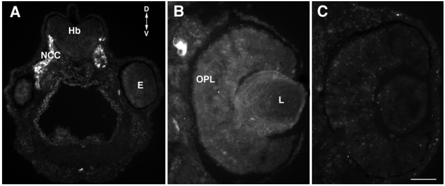 dorsal; E, eye; Hb, hindbrain; NCC, neural crest cells; L, lens; OPL,