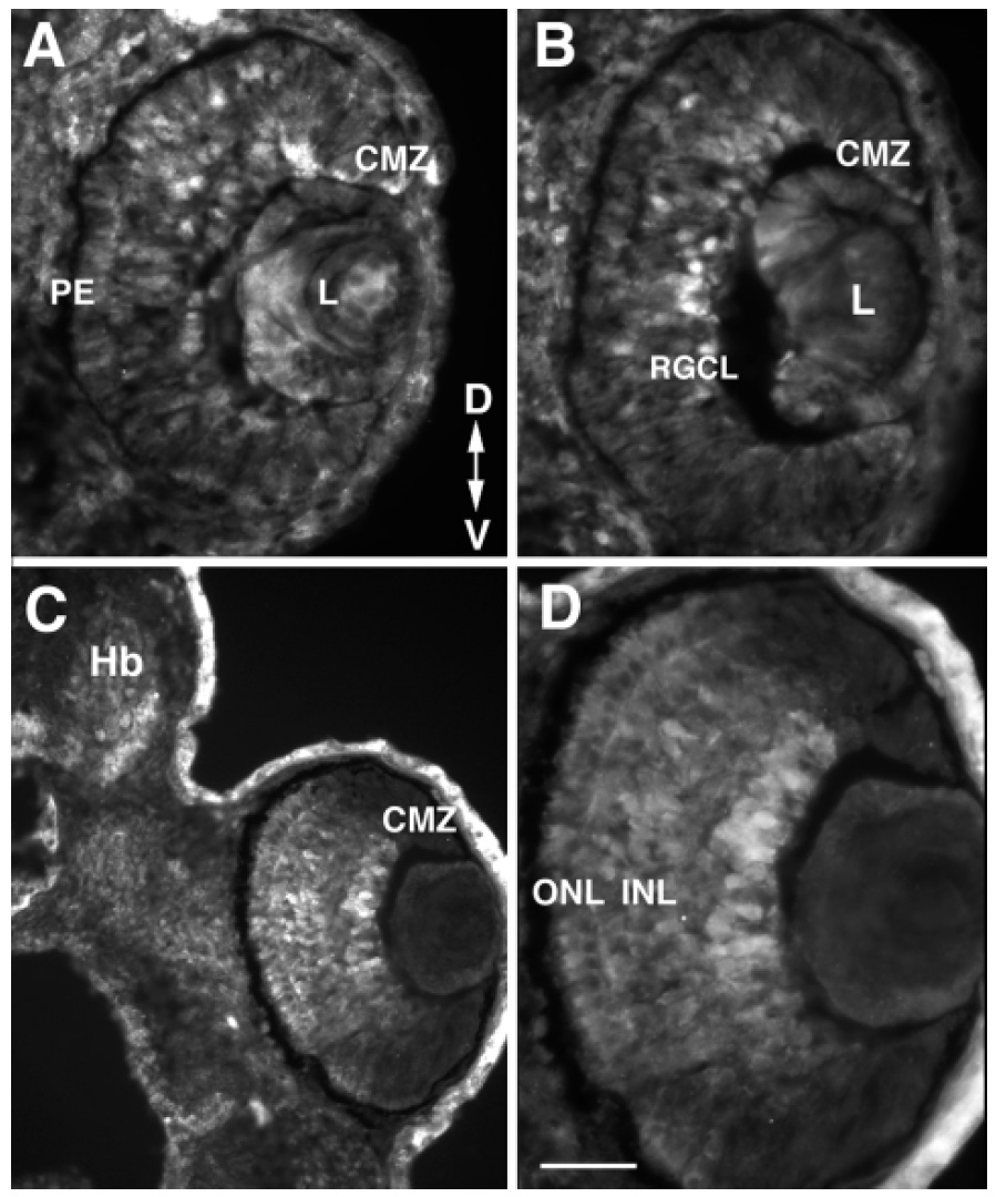 antibody immunolabels the CMZ and cells in the central retina, most
