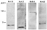 respective Kv channels. Lane 1: The Kv1.3 antibody detects a single