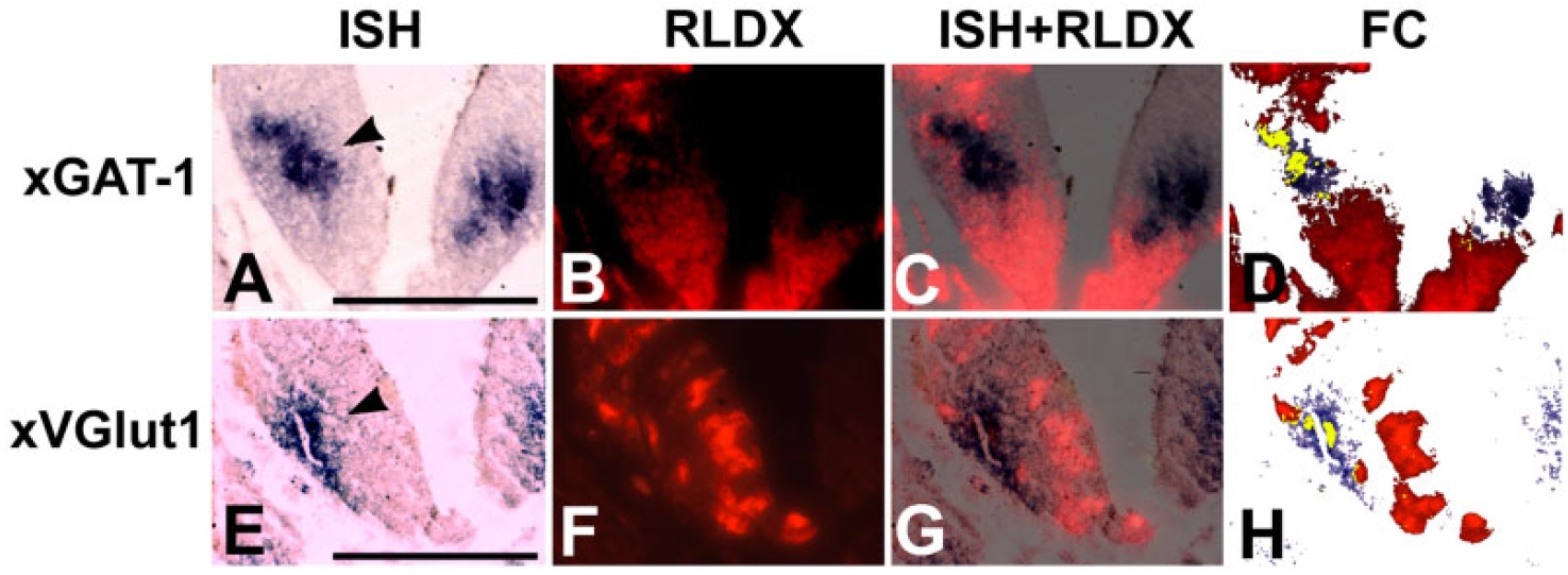 xGAT-1 or xVGlut1 expression with arrowheads indicating ISH staining.