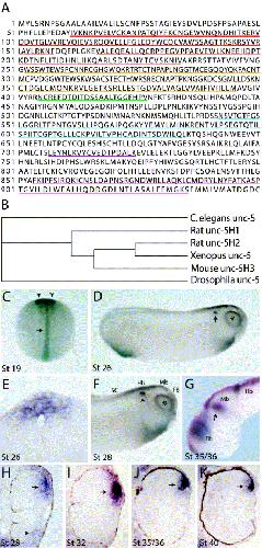 Fig. 1. (A,B) XUNC-5 protein sequence and homology. (A) Deduced XUNC-5 protein sequence. Ig domains are underlined in red, thrombospondin domains in yellow, transmembrane domain is in green, ZU5 domain is blue, DB motif is purple and the Death domain is in pink. (B) XUNC-5 homology tree. XUNC-5 shows highest homology to vertebrate UNC5H1, UNC5H2 and UNC5H3 (52, 77, 62% identity respectively). (CâK) Whole-mount and section in situ hybridization of xunc-5. (C) Dorsal view of stage 19 embryo. Anterior is up. Xunc-5 is expressed in the neural tube (arrow) and developing optic vesicles (arrowheads). (DâK) Dorsal is up and anterior is to the right. (D) At stage 26 xunc-5 transcripts are expressed around the periphery of the developing eye (asterisk) as well as in the otic vesicle (arrow), the developing brain and spinal cord. (E). Transverse section through a stage 26 embryo shows that xunc-5 transcript are confined to the dorsal spinal cord. (F) Xunc-5 expression at stage 28. Transcripts are expressed in the periphery of the developing eye (asterisk), otic vesicle (arrow), developing forebrain, midbrain, hindbrain and spinal cord. (G) Lateral view of a stage 35/36 dissected brain shows xunc-5 expression in the anteriortectum (arrow). (HâK) Transverse sections through the eye of a stage 28 (H), stage 32 (I), stages 35/36 (J) and stage 40 (K) embryo. Xunc-5 transcripts are initially expressed in both the dorsal (arrow in H) and ventral (arrowhead in H) ciliary marginal zones, and later become confined to the dorsal ciliary marginal zone (arrows in IâK). Fb, forebrain; Mb, midbrain; Hb, hindbrain; SC, spinal cord.