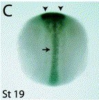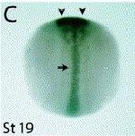 unc5b (unc-5 homolog B)gene expression in Xenopus laevis embryo, assayed via in situ hybridization, NF stage 19, dorsal view, anterior up.