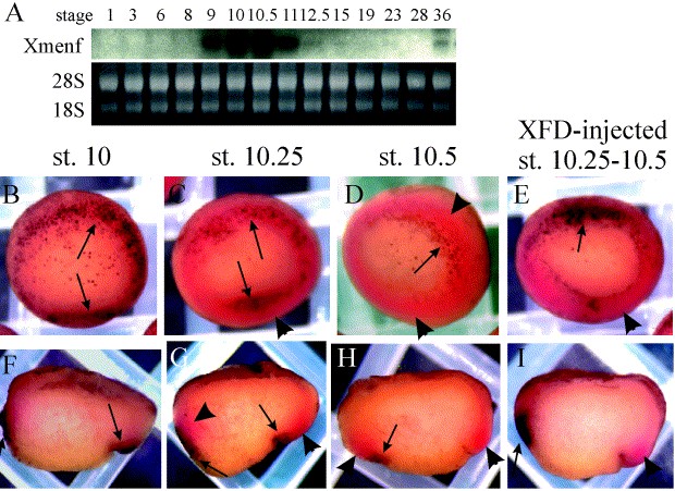 Fig. 4. Expression of Xmenf. (A) Expression of Xmenf in staged Xenopus embryos. Expression was first seen at the mid-blastula transition (stage 9). The expression persisted and peaked during gastrulation, and was no longer detectable after gastrulation, with the exception of late tailbud stage (stage 36). Ethidium staining for 28S and 18S RNAs served as a loading control. (BâD, FâH). Double in situ hybridization in gastrula embryos for Xmenf (black, arrows) and Xbra (red, arrowheads). Embryos in (BâD) are in vegetal views, oriented with the Spemann organizer at the bottom. (FâH) Midline sections with the Spemann organizer are to the right. At stage 10, staining for Xbra expression is very faint (B, F), while Xmenf is expressed in cells in the marginal zone just above the blastopore lip in the Spemann organizer (the right arrow in F), and in cells in the superficial layer of the side opposite from the organizer (the left arrow in F). Xmenf is also expressed superficially in vegetal cells (B). At stage 10.25, the expression domains of Xmenf and Xbra are not only mutually exclusive, most obviously near the Spemann organizer (the bottom part of the embryo in C and the right part of the embryo in G), but also opposite from the Spemann organizer (the left part of the embryo in G). Although the expression domains of the genes look as if they overlap in surface view (the top part of the embryo in C), the section shows that Xmenf is expressed in cells in the superficial layer of the animal marginal zone, while Xbra is expressed in cells in the deep layer (the left arrow and arrowhead in G). By stage 10.5, Xmenf is no longer expressed near the Spemann organizer, nor on the opposite side of the embryo in the superficial layer. At this stage, the expression domains of Xmenf and Xbra remain mutually exclusive in the marginal zone opposite from the Spemann organizer (the top part of the embryo in D and the left arrow and arrowhead in H). (E, I) Double in situ hybridization at stage 10.25â10.5 for Xmenf (black, arrows) and Xbra (red, arrowheads) in embryos that had been injected with XFD RNA in the marginal zone (B4 and C4 blastomeres at the 32-cell stage). The marginal zone on the injected side no longer expresses Xbra and shows very intense expression of Xmenf (arrow in E). The section in (I) reveals that Xmenf expression is expanded toward the region (arrow in I), where Xbra is normally expressed (arrowhead in H).