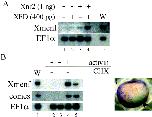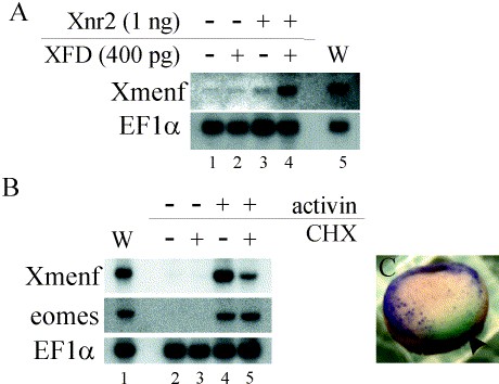 Fig. 5. Regulation of Xmenf expression. (A) Northern blot of RNA from stage 10.5 animal caps injected with 1 ng of Xnr2 RNA with or without 400 pg of XFD RNA. Shown are results of hybridization for Xmenf and EF1α (loading control). Also shown is RNA from a whole embryo at stage 32 (W, lane 5). Xnr2 RNA alone induces a low level of Xmenf expression in animal caps (lane 3), while coinjection of XFD RNA causes a much higher level of Xmenf expression (lane 4). (B) Northern blot of RNA from stage 10 animal caps that had been injected with 400 pg of XFD RNA at the two-cell stage and cultured after dissection at stage 8 in activin-containing COS cell media (Hansen et al., 1997), with or without 5 μg/ml of cycloheximide (CHX). Results of hybridization for Xmenf, eomes and EF1α (loading control) are shown. Induction of Xmenf expression by activin was significantly reduced in the presence of CHX (lane 5 compared to lane 4), while eomes expression was not affected by CHX as described previously (Ryan et al., 1996). âWâ represents RNA from a whole embryo at stage 10 (lane 1). (C) In situ hybridization for Xmenf in embryos that had been injected with 500 pg of CmXnr2 RNA in one blastomere at the four-cell stage. Vegetal view with the Spemann organizer at the top. β-Gal staining in blue (arrowhead) is indicative of descendants of the injected cell. Xmenf expression is lost in descendants of the CmXnr2-injected blastomere (arrowhead).