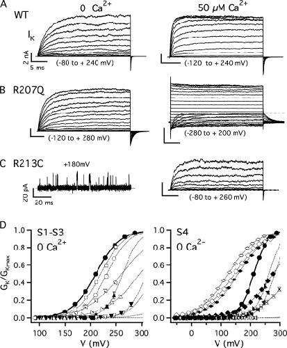 Figure 2. Mutation of charged residues in voltage sensor domain alter mSlo1 gating. Families of IK evoked from (A) WT (B) R207Q, and (C) R213C channels in response to pulses to different voltages at 20-mV intervals from a holding potential of −80 mV. Currents in 0 Ca2+ and 50 μM Ca2+ for each channel were recorded from the same patch. Dashed lines indicate the zero current level. (D) GK-V relations (mean ± SEM) for WT and mutant channels are normalized by GKmax determined in 50 μM Ca2+ and are fit by Boltzmann functions (lines). WT (•), R113Q (○), D133Q (□), D153K (▪), D153C (▵), Y163E (▴), R167E (▿), R167A (▾), E180A (), D186A (), R201Q (), R207E (), R207Q (), R210C (), R210E (), R210N (), R213C (), R213E (), E219Q (). |