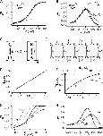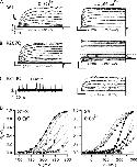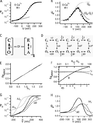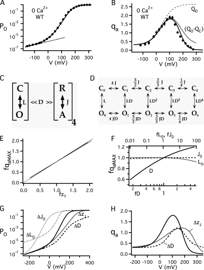 Figure 3. Data analysis and modeling. (A) Po-V relation for WT mSlo1 channels in 0 Ca2+ (mean ± SEM) is plotted on a semilog scale and fit by the HCA model (solid line, see be-low). The limiting slope at negative voltages is indicated by a dashed line representing the partial charge associated with channel opening (zL = 0.3 e). (B) qa-V relation determined from the logarithmic slope of mean PO (see MATERIALS AND METHODS). (C) HCA gating mechanism asserts that equilibration of the channel gate between closed and open (C–O) is influenced allosterically by four independent and identical voltage sensors that each can be in a resting or activated state (R–A). The equilibrium constants for channel opening L and voltage sensor activation J are voltage dependent with partial charges zL and zJ, respectively (). The activation of each voltage sensor increases the C–O equilibrium constant by an allosteric coupling factor D. (D) Gating scheme shows the closed and open states (Ci, Oi, where i = number of activated voltage sensors) and equilibrium constants specified by the HCA mechanism. Horizontal transitions represent voltage sensor activation, and vertical transitions represent channel opening. Solid lines in A and B represent best fits to the HCA model (zJ = 0.59 e, zL = 0.3 e, J0 = 0.017, Lo = 1.4 × 10−6, D = 23.1) determined by a semi-automated method (see MATERIALS AND METHODS). Dashed lines in B indicate the charge distribution for open channels (QO, Eq. 5) and the difference between charge distributions for open and closed channels Qo − Qc, Eq. 6), defined by the fit parameters. (E–H) Predicted effects of changing various parameters in the HCA model. (E) Changes in peak qa, expressed as a fraction of the control value (fqaMAX), produced by changing gating charge (zJ, zL) are directly proportional to the fractional change in total gating charge (fzT, where zT = zL + 4zJ). Dashed line indicates unity slope (b = 1). Solid lines indicate effects of proportional changes in both zL and zJ (b = 0.99) or changing zJ alone (b = 0.94). (F) Effects on fqaMAX of fractional changes in L0, J0, or D. (G) Effects on PO-V relation of changing zJ(0.35 e), D(5.1), J0(1.7), or L0(1.4 × 10−4) and leaving other parameters the same as the WT (solid line). (H) The decreases in zJ or D both decrease qaMAX relative to the WT (solid line) but have distinct effects on the qa-V relations. In particular, the steepness of the foot of the curve is reduced together with zJ but is not altered by changing D. |